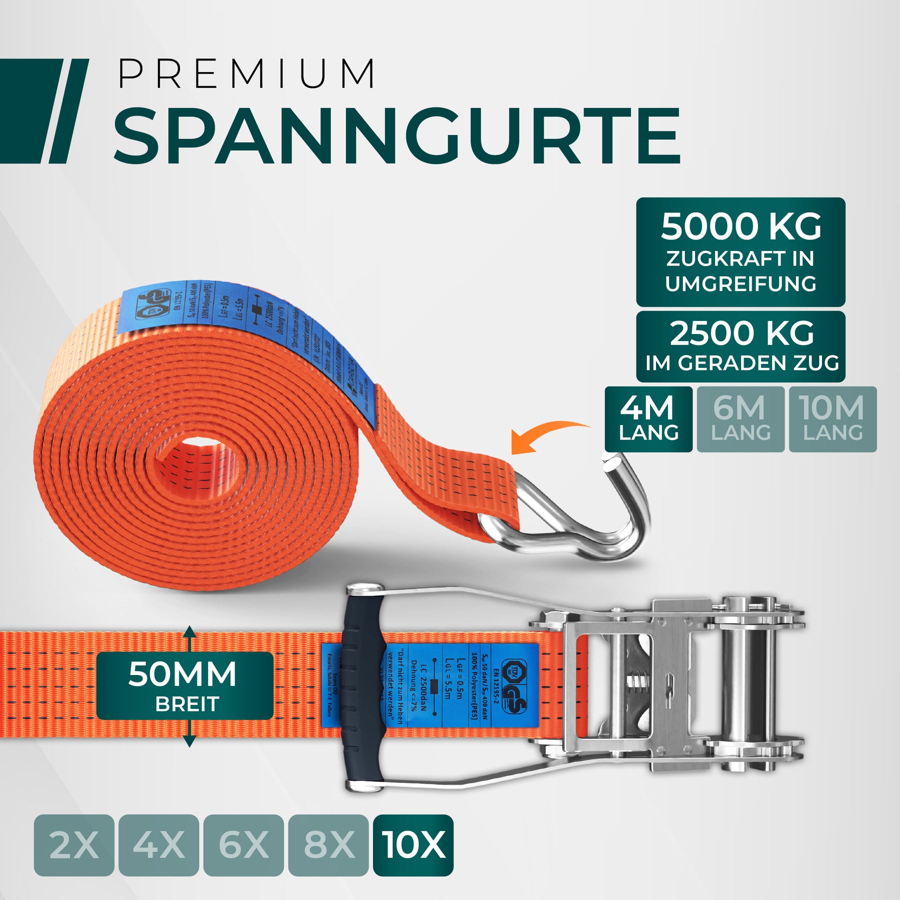 • 🛡 TÜV/GS & DIN Geprüft: Unsere 5000kg Ratschengurte erfüllen höchste deutsche Sicherheitsstandards und sind nach DIN EN 12195-2 für Schwerlastanwendungen zertifiziert.