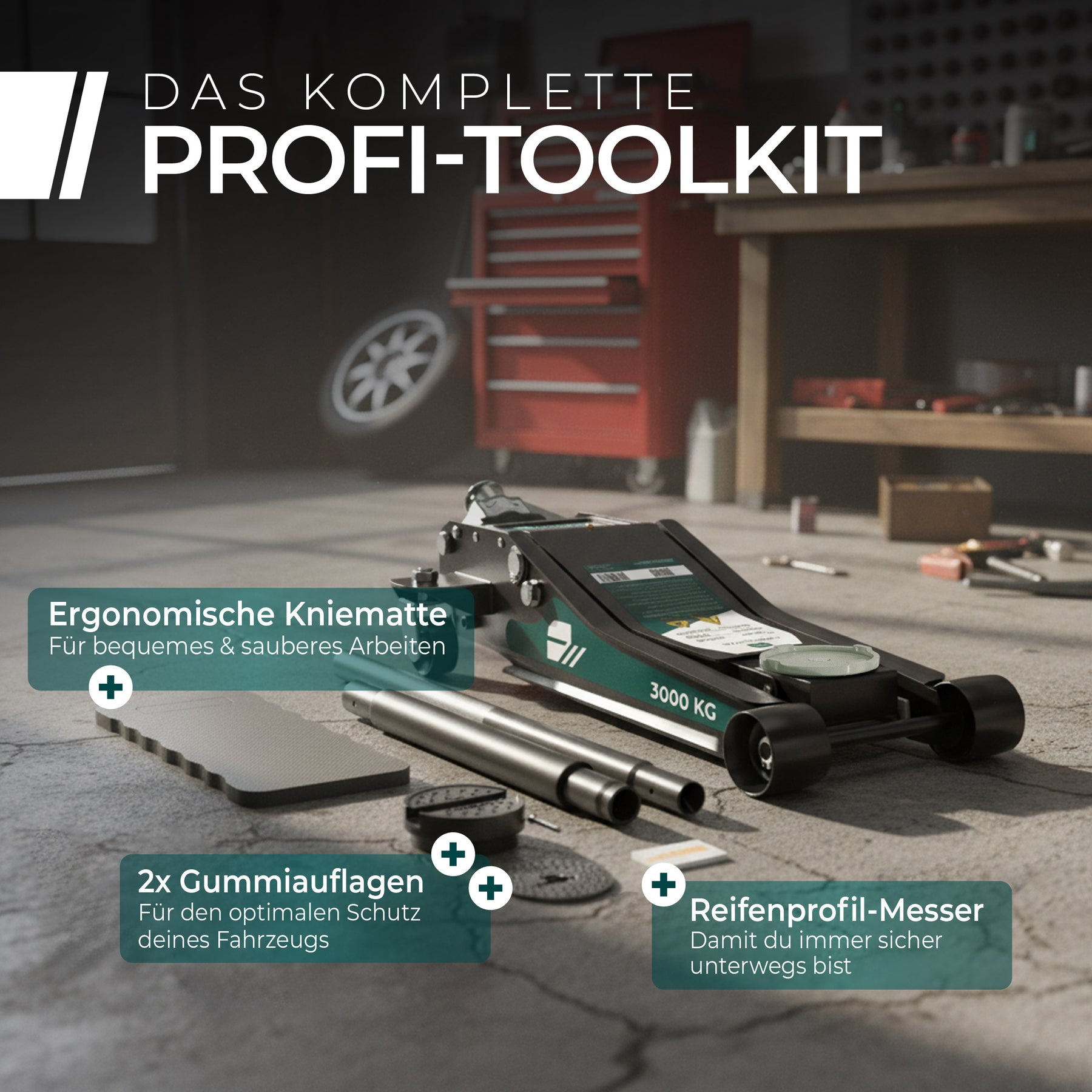 • DAS KOMPLETTE PROFI-TOOLKIT: Du erhältst mehr als nur einen Wagenheber. Im Set enthalten sind: eine ergonomische Gelenkschutzmatte, ein Reifenprofilmesser zur Sicherheitskontrolle und zwei hochverdichtete Gummiauflagen für maximalen Fahrzeugschutz.